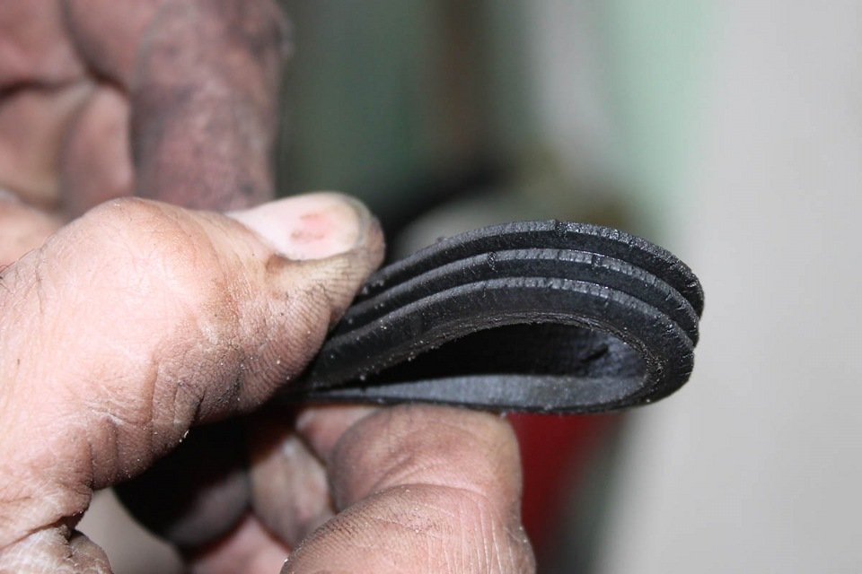 - Расслоение 0 такая неисправность обычно происходит в результате повреждения валов. Когда геометрия этого компонента нарушается, с одной стороны ремешок сильно изнашивается и за края его резины начинает выходить армированная нить. Причиной расслоения также может быть эксплуатация некачественного материала при производстве.