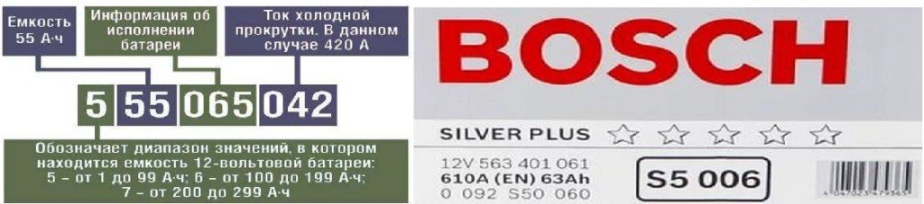 - С — параметр номинальной общей емкости устройства, расшифровывающийся в ампер-часах. Если после С идет цифра 60, то это значит, что емкость батареи составляет 60 ампер-часов, если 65 — соответственно, 65 Ач;