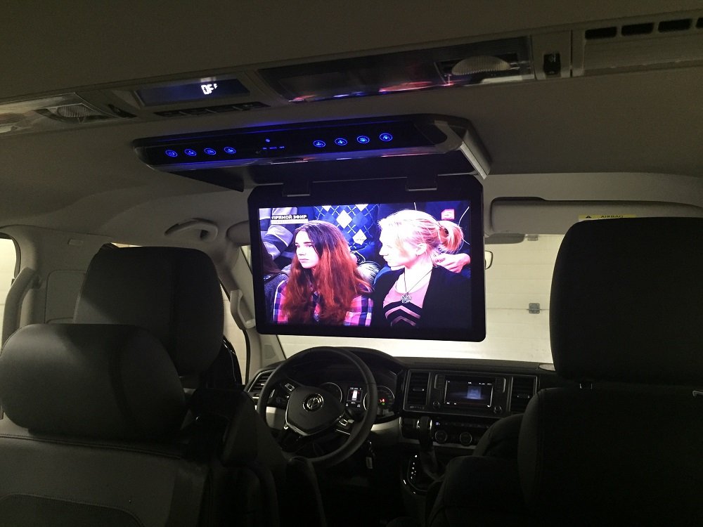- На потолке. Это удобно для путешествия семьей, так как он хорошо просматривается с задних сидений. Часто потолочные устройства устанавливаются в маршрутках и на автобусах для развлечения пассажиров.
