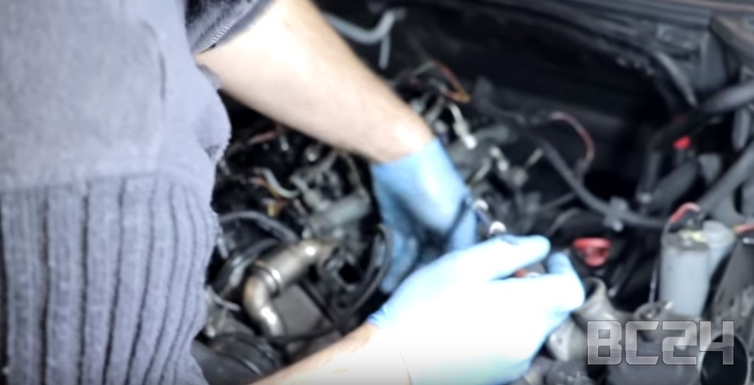 Задача в принципе простая, нужно демонтировать впускной коллектор, выкрутить свечи накаливания и залить в камеру сгорания определенное количество раскоксовывателя. Нам понадобится набор головок, пара гаечных ключей, перчатки.