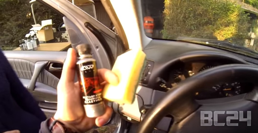 На начала испробуем реставратор полироль пластика. Его нельзя использовать на педалях и руле. Наносить нужно на очищенную панель.