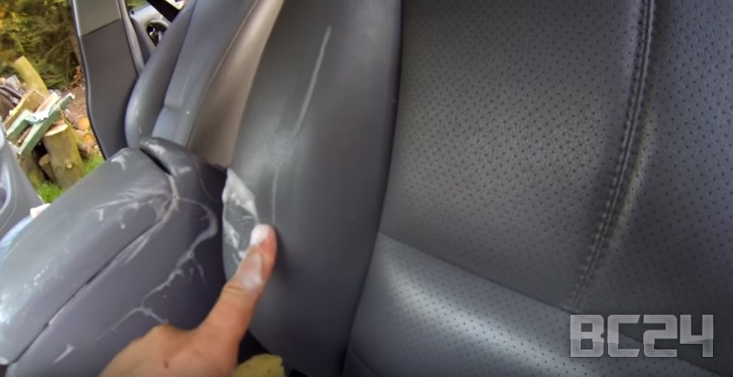 На фото можно увидеть загрязненные поры в коже салона автомобиля, если очиститель кожи справится, то будет просто замечательно.
