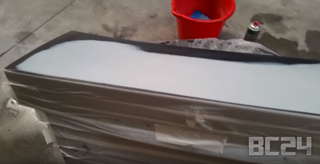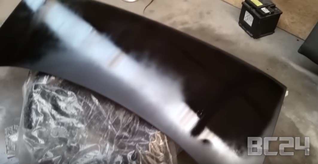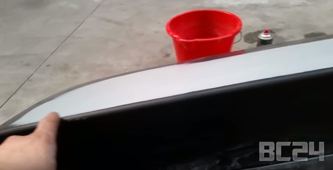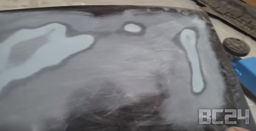 Сделали подложку первым попавшимся черным баллончиком с краской. Его цель, чтобы ушел цвет грунтовки, чтобы ушло в итоге как можно меньше родной краски, так как она дорогая.