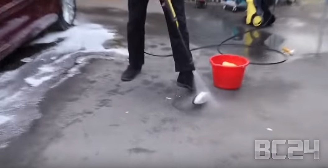 Если моете автомобиль на мойке самообслуживания, то обязательно обдайте с керхера щетку, как показано но фото.
