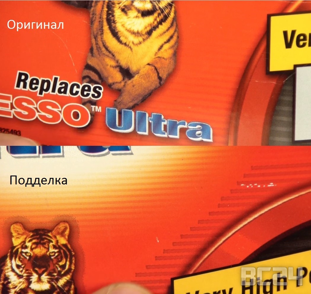 На оригинальной продукции задний фон у тигра светлый, а на подделке — темный.
