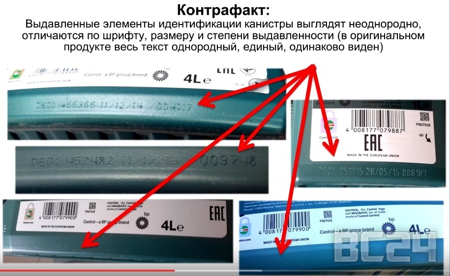Выдавленные элементы с кодом идентификации, обозначением страны производителя, датой — должны быть однородными и четко выдавленными. На контрафакте выдавленные элементы идентификации канистры выглядят неоднородно и отличаются по шрифту, размеру и степени тиснения.