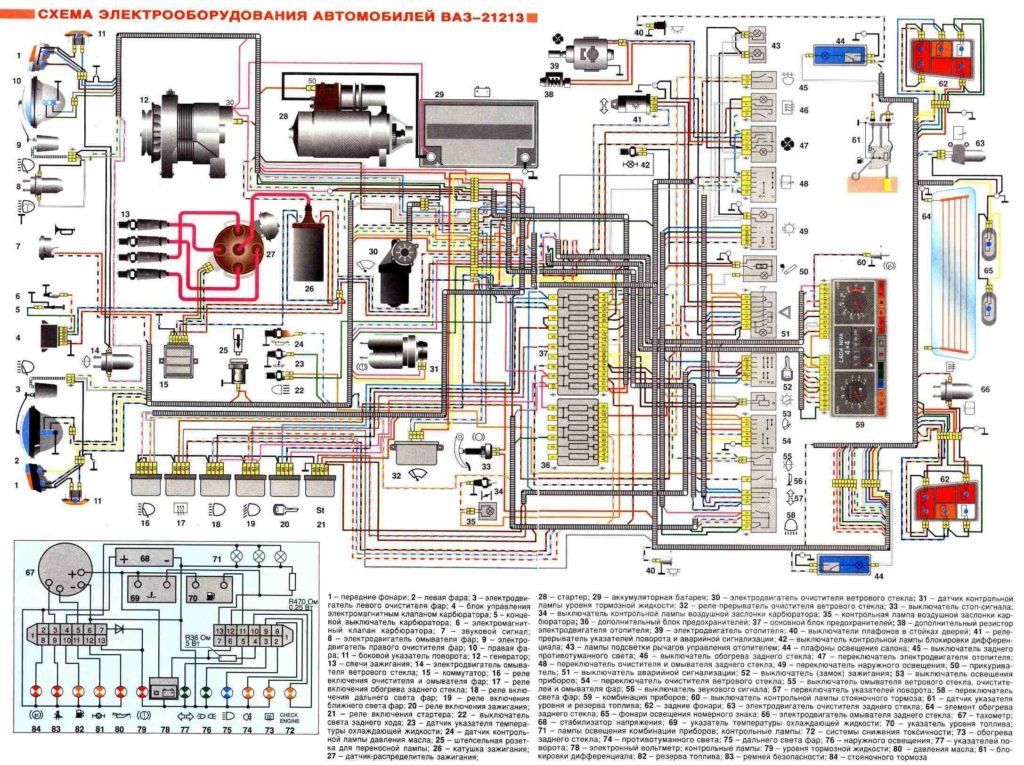 Электрическая схема ВАЗ 21214 (21213, 2121 и 2131) Нива инжектор и карбюратор с описанием проводки