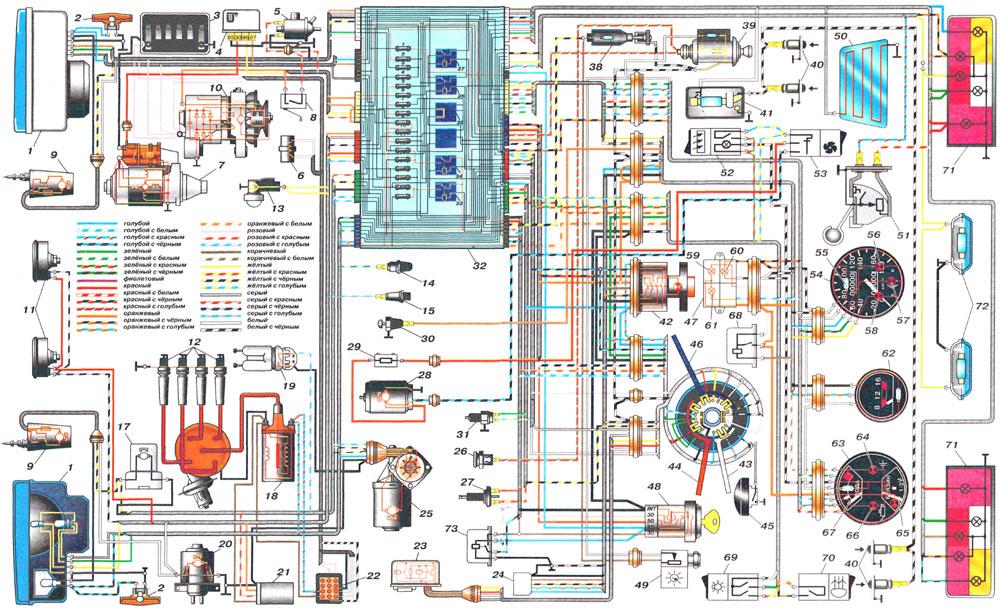 Схема электрооборудования ВАЗ состоит из многих компонентов. Речь идет о генераторе, аккумуляторе, оптике, блоках предохранителей, контрольных лампах, а также приборной панели и прочих компонентах. Речь идет как об инжекторе, так и карбюраторных двигателях. Провода системы маркируются разными цветами, они соответствуют тем, которые отмечаются на схемах, это дает возможность автовладельцу не запутаться в ходе диагностики цепи и ремонте.