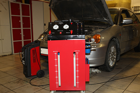 - Двигатель должен поработать минут двадцать, чтобы все отложения могли полностью раствориться благодаря промывочной жидкости. Затем вся смесь проходит через установку. За процессом и цветом смеси можно наблюдать через специальное окошко для наблюдения. Кроме того, установка имеет встроенный манометр, на котором показывается уровень рабочего давления масла. Когда промывочная жидкость станет розового цвета, процесс промывки считается законченным.