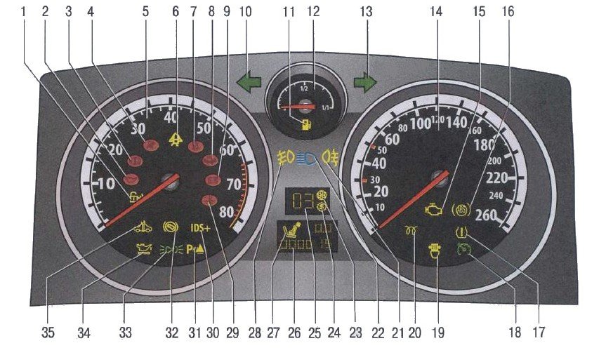 Контрольный щиток Опеля с обозначением компонентов