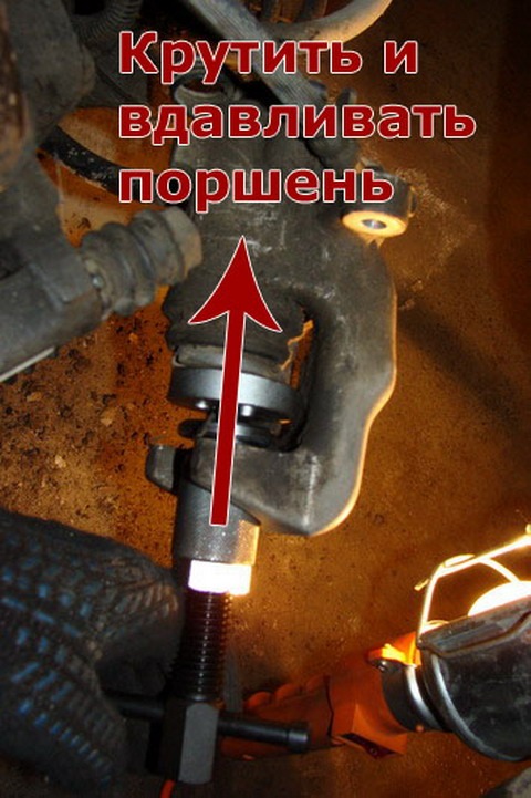 - Используя спец. Инструмент, вдавливаем поршень, одновременно подкручивая его;